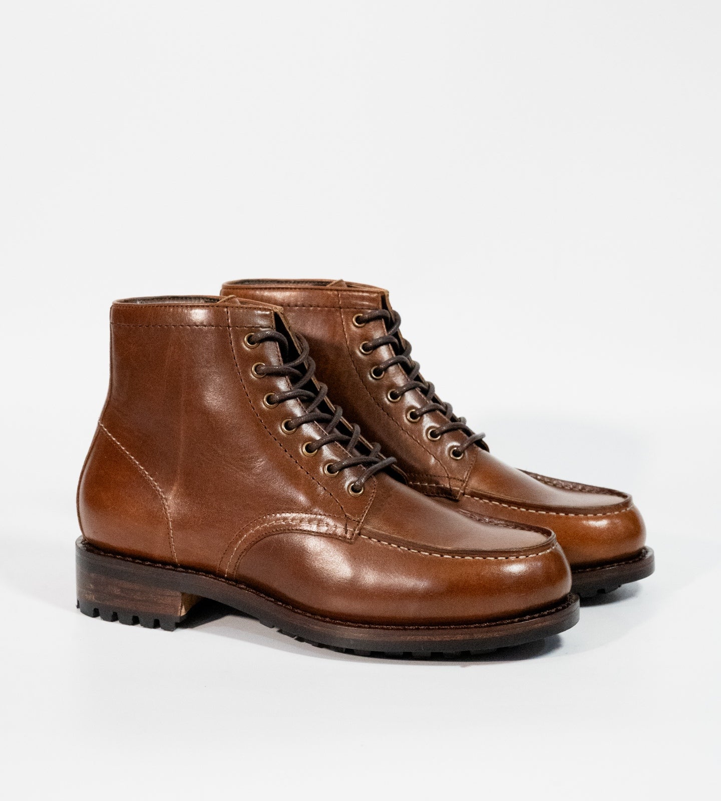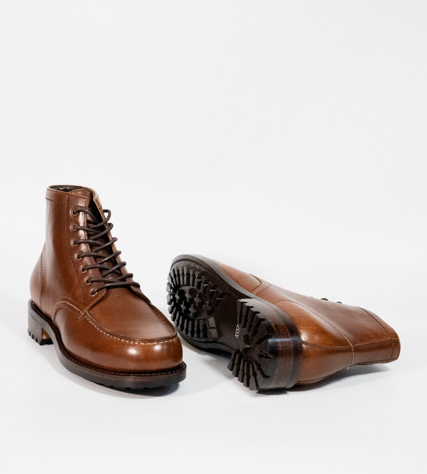 Discover rugged sophistication with our Oiled Leather Tan Moc-Toe Boot. Built with durable Goodyear welted construction, these boots promise exceptional longevity and flexibility. The premium oiled leather upper enhances natural water resistance and develops a unique patina over time, adding character with every wear. Featuring a distinctive moc-toe design, these boots blend classic craftsmanship with contemporary appeal.