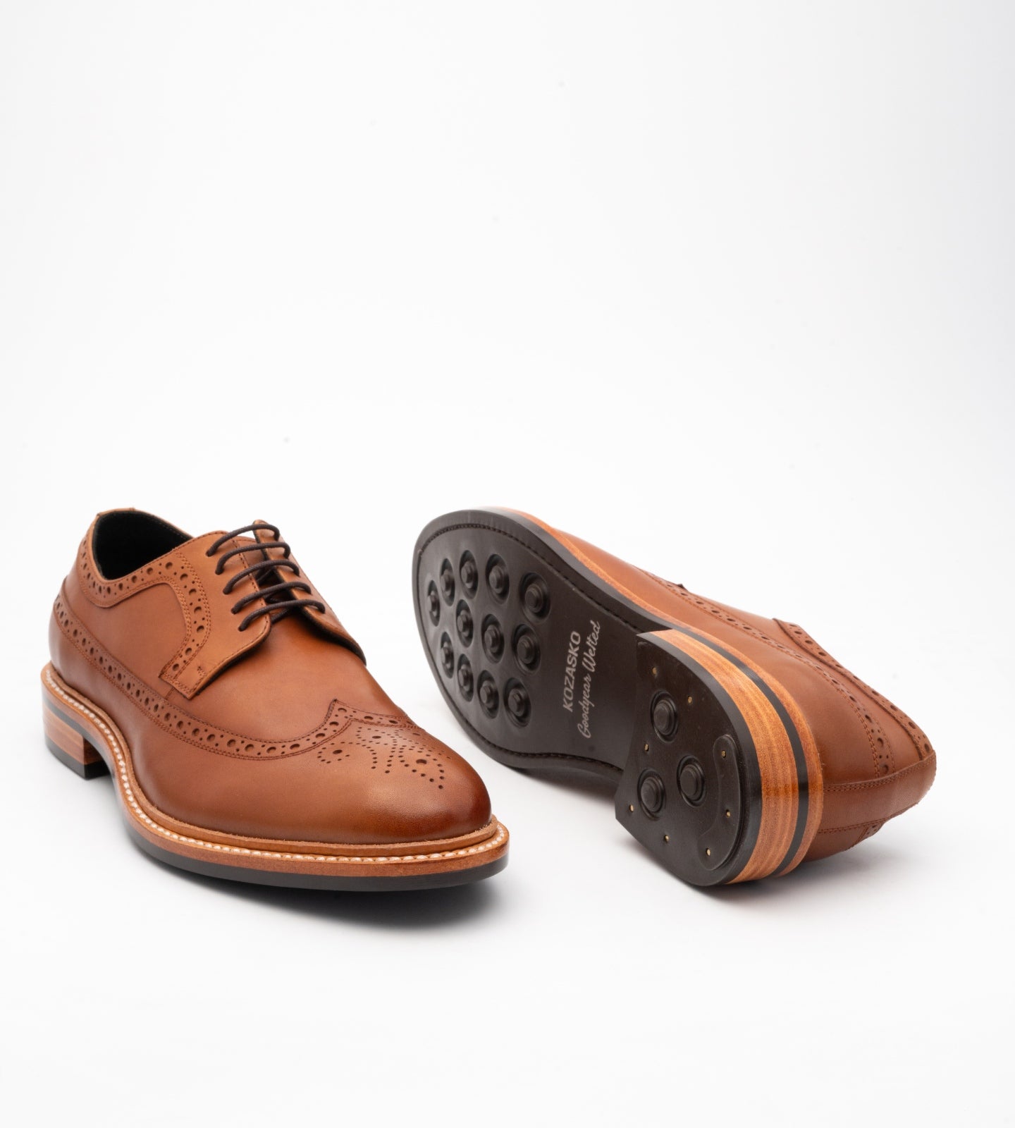Meticulously crafted Tan Longwing Blucher shoe. Handmade with premium full-grain crust leather and Goodyear welted for enduring quality. Its timeless wingtip design exudes sophistication, perfect for weddings or cocktail parties. With a roomy toe box and sturdy Blucher construction, it offers both style and comfort for frequent wear.
