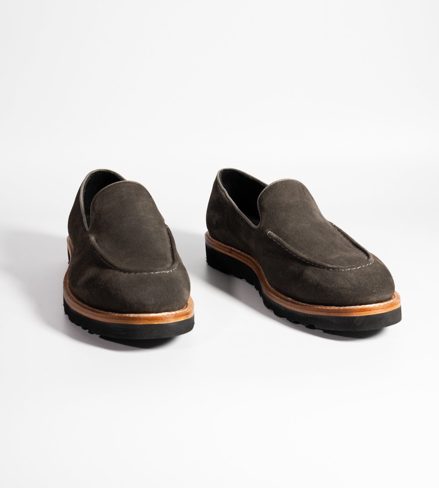 Handcrafted slip-on loafers redefine classic elegance with a minimalist design. Featuring a plain vamp and apron toe, these loafers exude sophistication without the traditional penny cut. Perfectly versatile, they complement both casual and formal attire. Made from premium grey suede leather, these loafers ensure durability and a polished look, while the easy slip-on design offers unmatched convenience and a snug fit. Artisan craftsmanship and refined details make these loafers a timeless addition to any wardrobe, providing comfort, elegance, and a seamless blend of tradition and modernity.