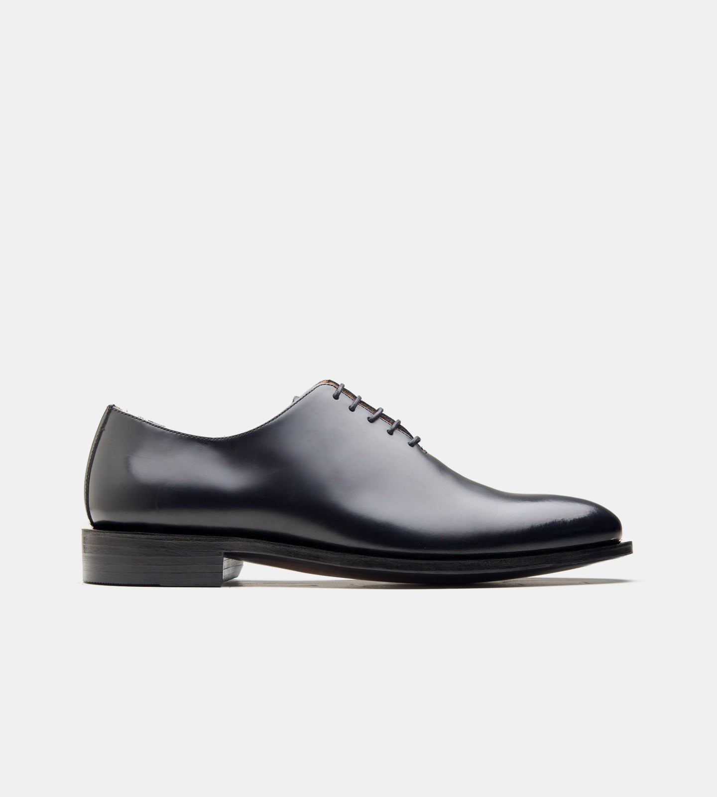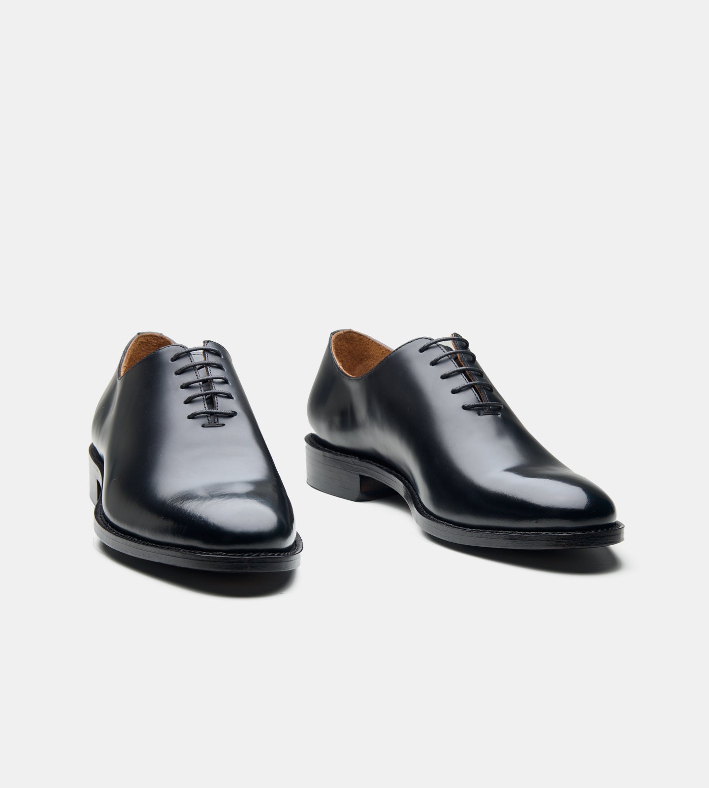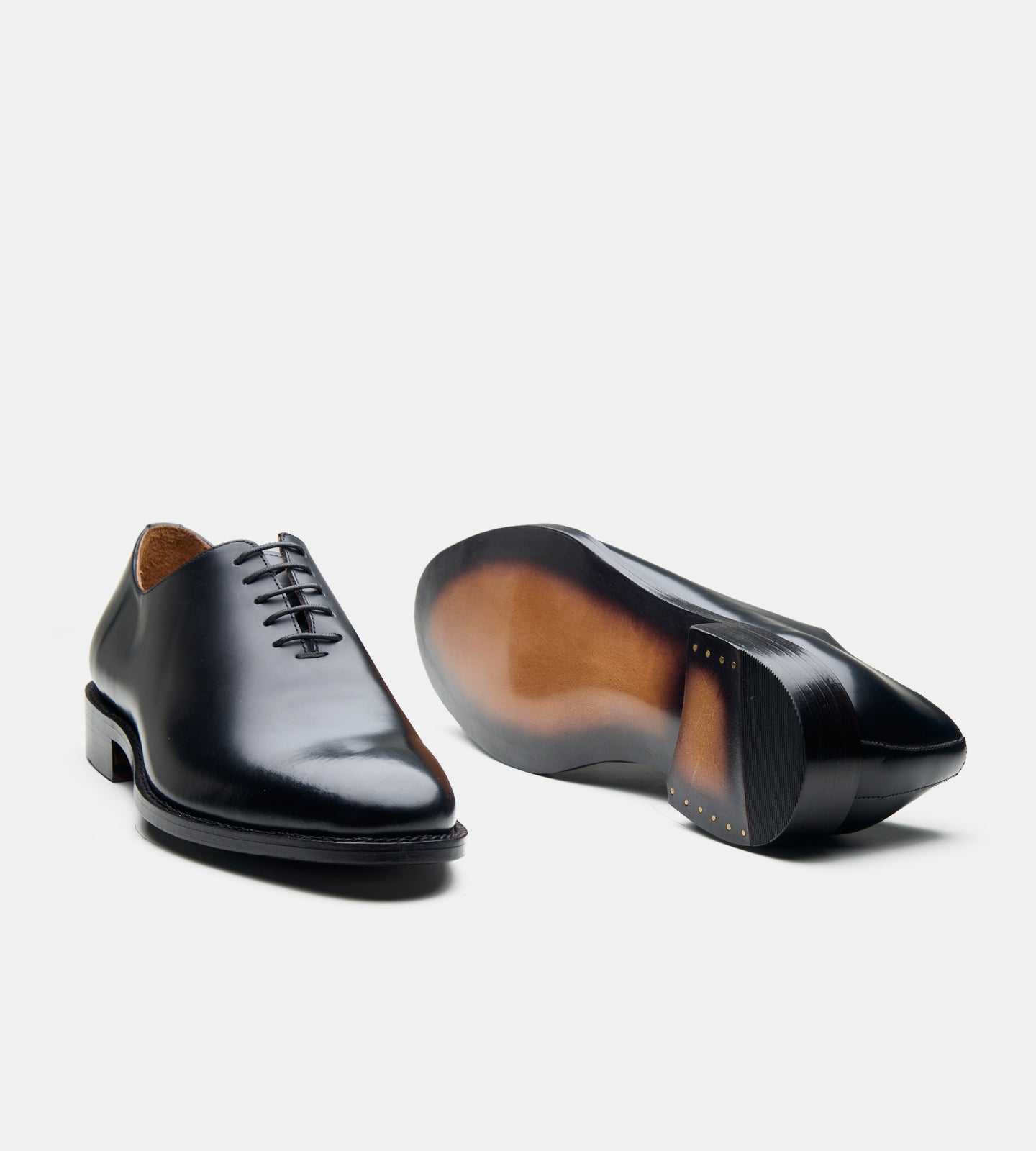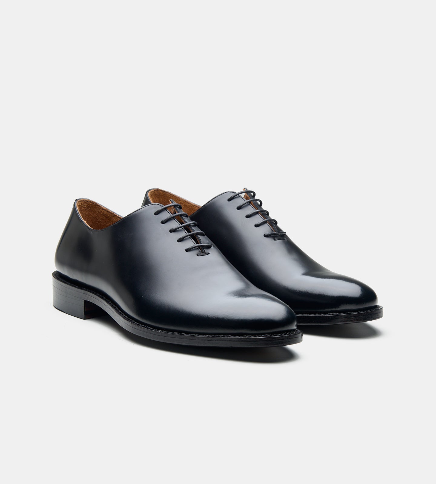 Crafted from premium calf leather sourced from the renowned Sadesa tannery, these Goodyear welted black wholecut oxford shoes are designed for the discerning individual. The almond toe shape offers a sleek, refined silhouette that seamlessly complements any business meeting or high-end event. With an Argentinian leather sole featuring a hidden channel, these shoes combine durability with elegance.