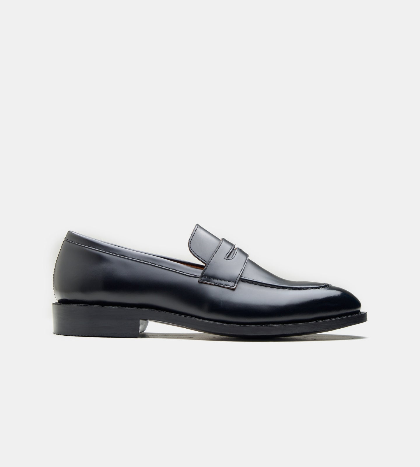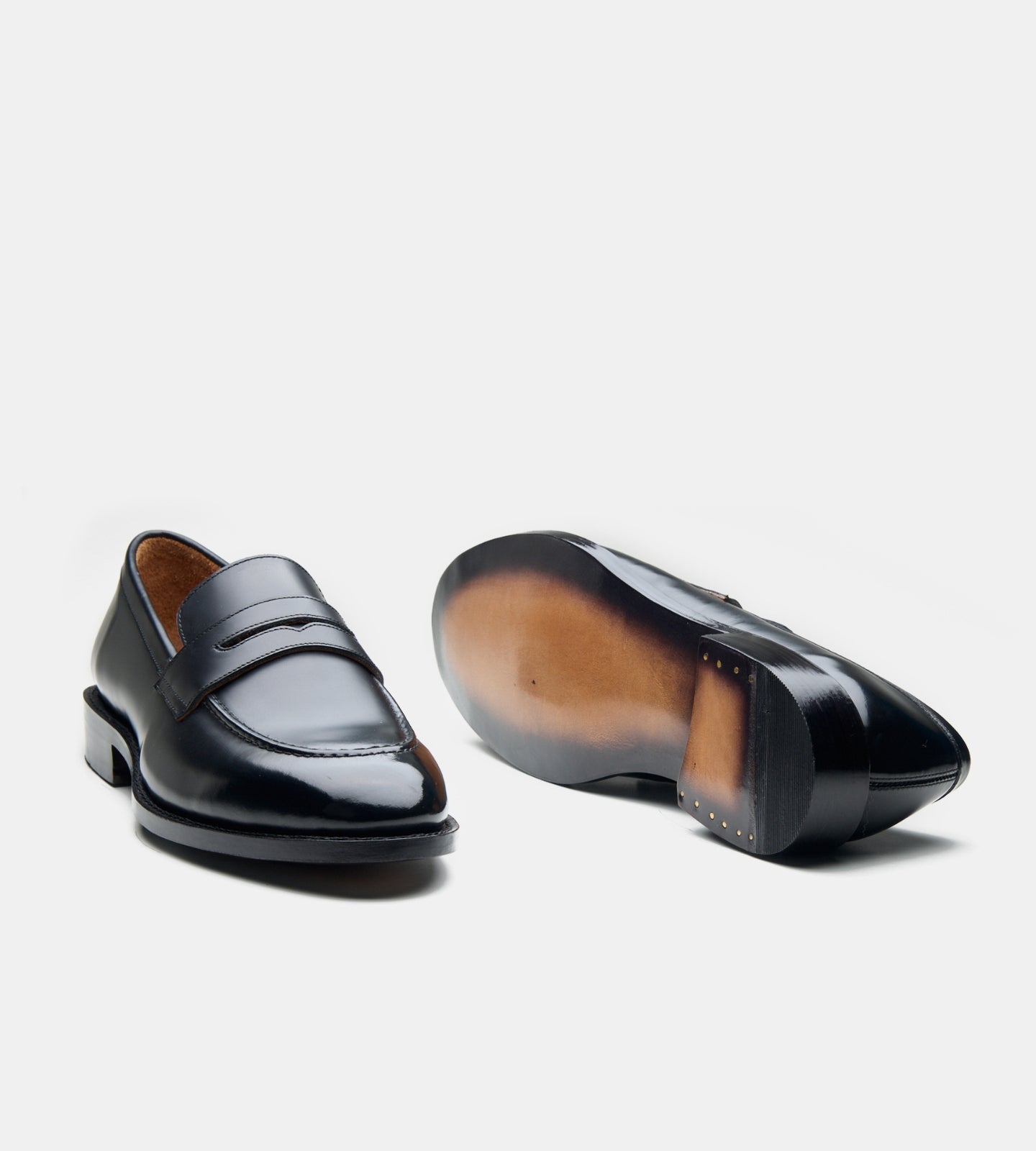 The Michigan Calf Black Penny Loafer is a timeless addition to any wardrobe. Designed in an elegant almond toe and constructed with meticulous hand-welted craftsmanship, this shoe offers both refinement and durability. The vegetable-tanned drum-dyed leather lining enhances comfort, while the Argentina leather sole and hidden channel stitching deliver a premium finish.