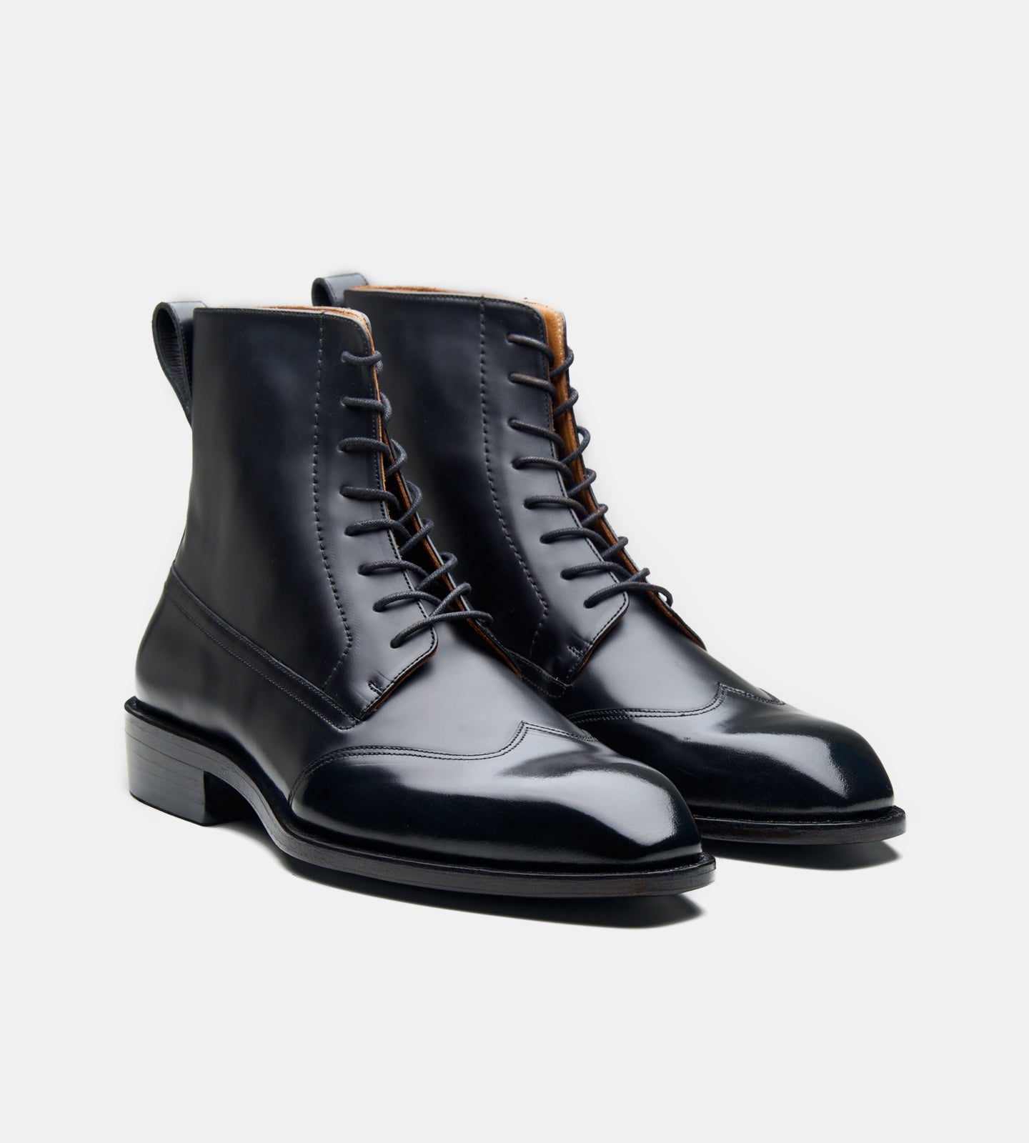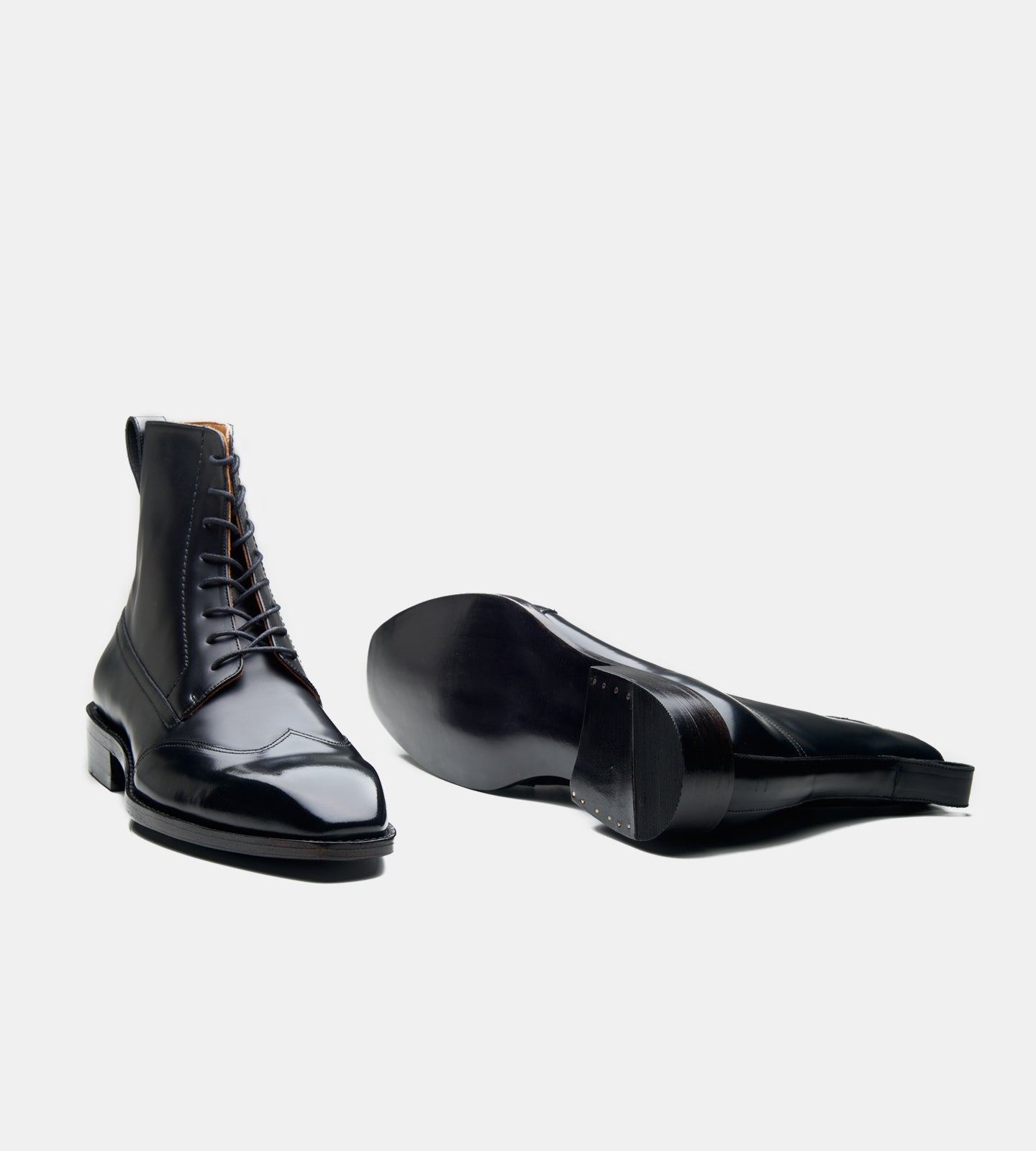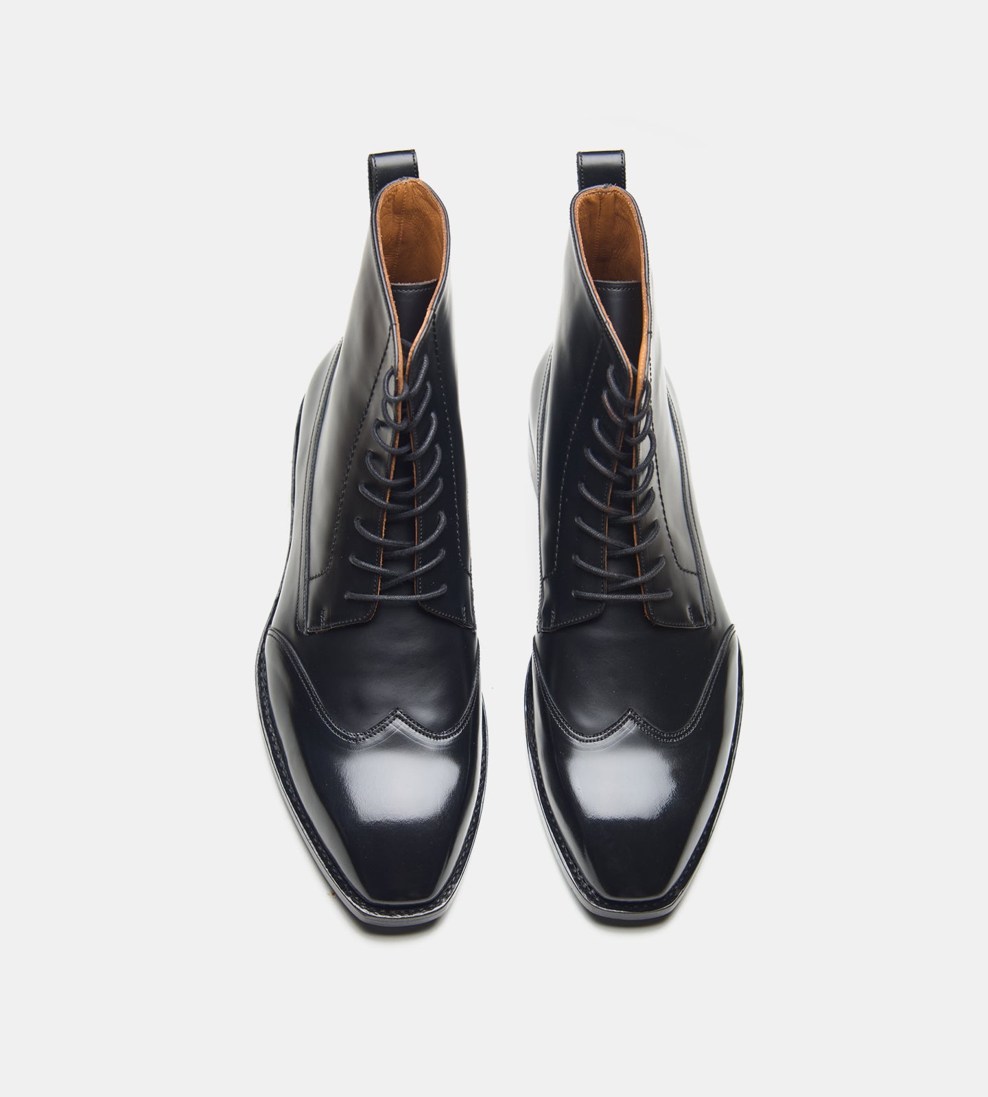 The Michigan Calf Black Dress Boots embody refined craftsmanship with a sleek chisel toe and wingtip design. Expertly handwelted, these boots feature a smooth, uninterrupted leather surface, showcasing the premium quality of the materials used. The wingtip design, a classic in dress footwear, adds a subtle yet distinguished touch, making it an essential in any well-curated wardrobe. Crafted with premium calf leather and vegetable-tanned, drum-dyed leather lining, these boots offer lasting comfort and a rich feel. Hidden channel stitching and a high-quality Argentinian leather sole enhance both durability and luxury.